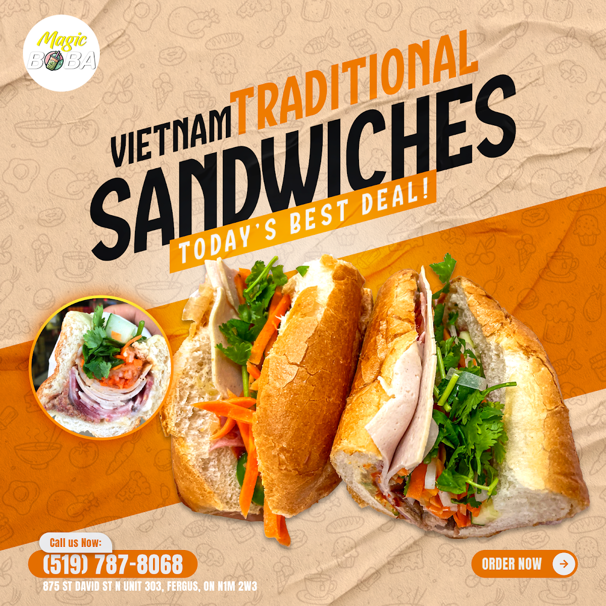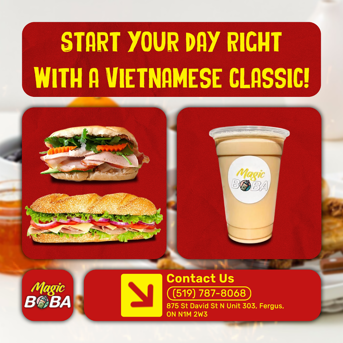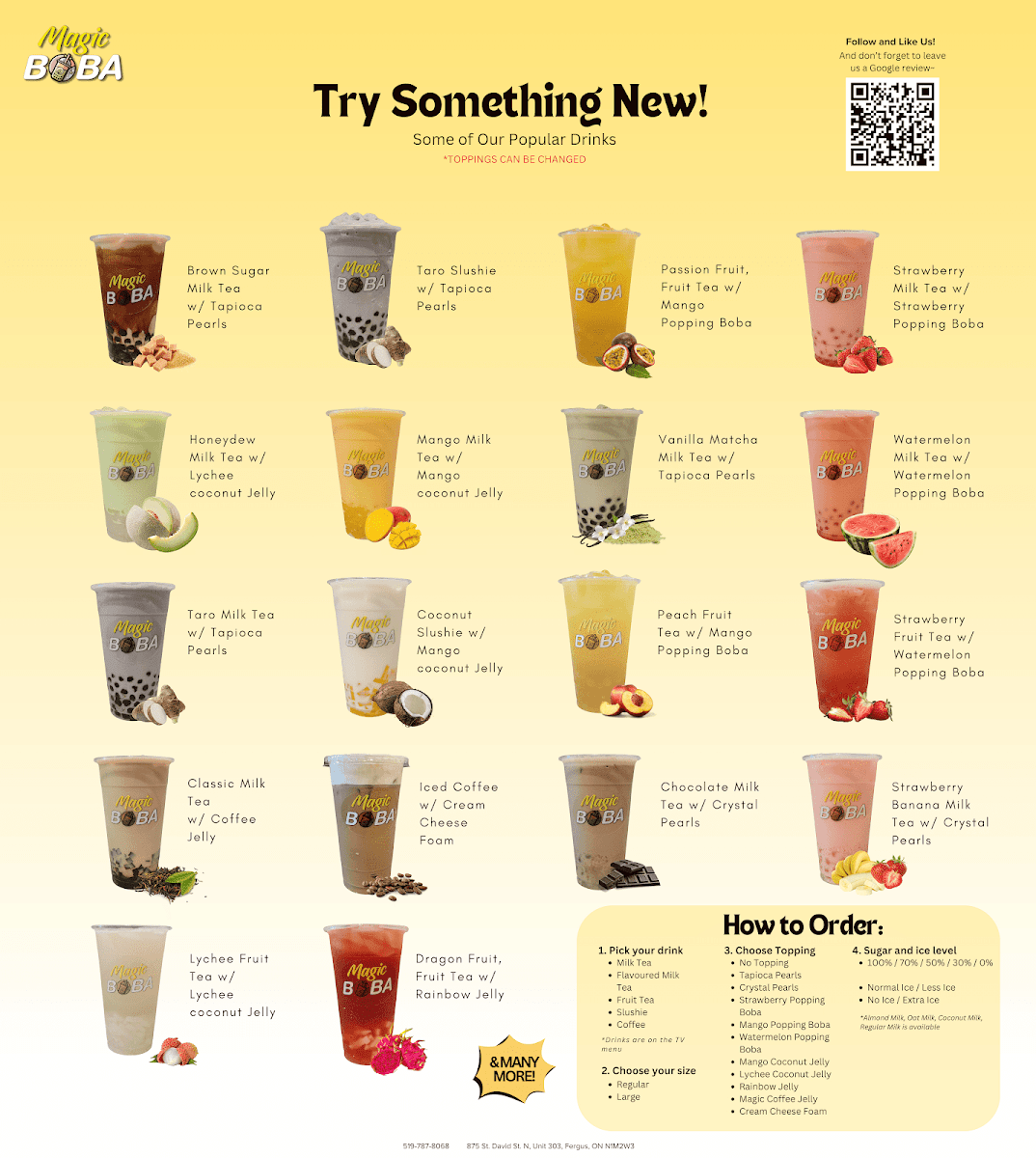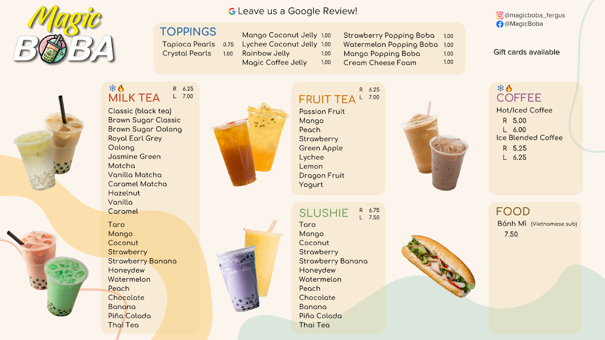 The menu at Magic Boba offers a delightful range of beverages and snacks that are sure to satisfy various tastes. For fruit tea enthusiasts, there are options like Yogurt Fruit Tea, Strawberry Fruit Tea, Peach Fruit Tea, Lychee Fruit Tea, and Dragon Fruit Fruit Tea, each offering refreshing, vibrant flavors. The milk tea selection includes comforting choices such as Caramel Milk Tea, Vanilla Matcha Milk Tea, Royal Earl Grey Milk Tea, and Brown Sugar Oolong Milk Tea, perfect for those looking for creamy indulgence. For a more refreshing treat, their slushie offerings like Coconut Slushie, Watermelon Slushie, and Strawberry Banana Slushie are great choices. Coffee lovers can enjoy a Coffee or an Ice Blended Coffee for a pick-me-up. The flavored milk teas, including Watermelon Milk Tea, Chocolate Milk Tea, and Mango Milk Tea, provide a sweet twist to the classic milk tea. The food menu includes a savory Banh Mi (Vietnamese Sub), a satisfying choice for a quick bite. For those with a sweet tooth, Magic Boba also serves an array of baked goods like Cookie, Apple Danish, Trick Or Treat Donut, Lemon Danish, and Cherry Blossom Donut. With its broad selection of beverages and tasty treats, Magic Boba provides a delightful experience for every craving.