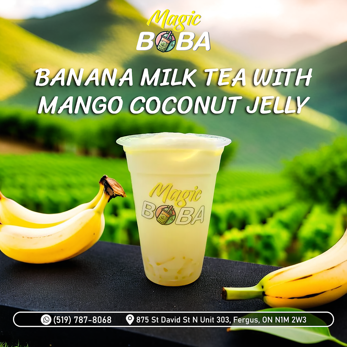 Banana milk tea with customizable size, sugar (from no added to 130% extra), and ice levels. Can be made COLD or HOT (choice in ICE LEVEL)